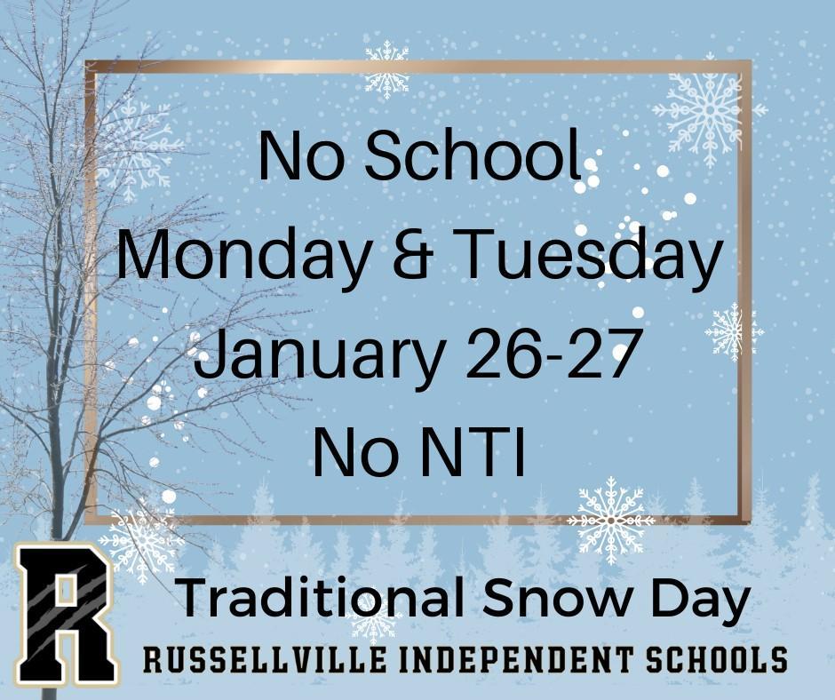 Russellville Independent Schools will be closed Monday & Tuesday due to inclement weather. These will be traditional snow days. Stay safe and warm!